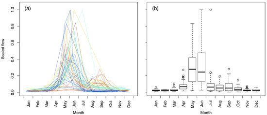 Yearly stream-flow data for 64 randomly selected locations in the study area. The locations were selected from a set in which flow gaging occurred consistently during the year with gaps between measurements of less than 4 months. The year corresponding to each location varies in the period 1983–2012 because gaging campaigns were not consistent. For this same reason, flow gaging observations are not equally spaced in time. The abscissa represents the sampling date, and the ordinate represents a scaled flow, which corresponds to the ratio of streamflow to maximum streamflow recorded at the location. The scaling is performed to improve visualization. Continuous lines connect the streamflow values at a given location and year (a), and the box plots represent the distribution of flows in each month (b), where the thick horizontal line is the median, the box limits are the first and third quartiles, the whiskers are 1.5 times the interquartile range beyond the quartiles, and the open circles are potential outliers. The data were compiled from the USGS Water-Quality Data for the Nation [37].
