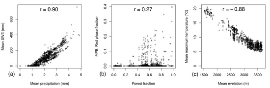 Pairwise comparison of potential predictor values for the 1174 DOC data points and their associated Pearson correlation: (a) yearly mean monthly precipitation and yearly mean monthly SWE; (b) forest fraction and MPB-Red phase fraction; and (c) mean elevation and yearly mean monthly maximum temperature.