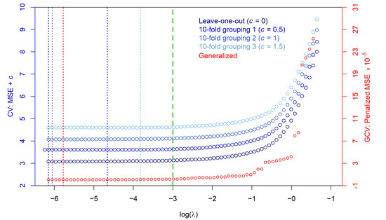 - Golub, G.H.; Heath, M.; Wahba, G. Generalized Cross-Validation as a Method for Choosing a Good Ridge Parameter. Technometrics 1979, 21, 215–223. [Google Scholar] [CrossRef]