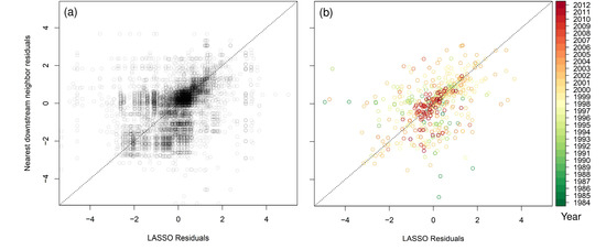 Comparison of the LASSO residuals with respect to the residual of the corresponding nearest downstream neighbors. The units of the residuals are mg/L. Panel (a) includes all neighboring pairs regardless of the year while panel (b) only includes neighboring pairs from the same year, and the color bar represents the corresponding year.
