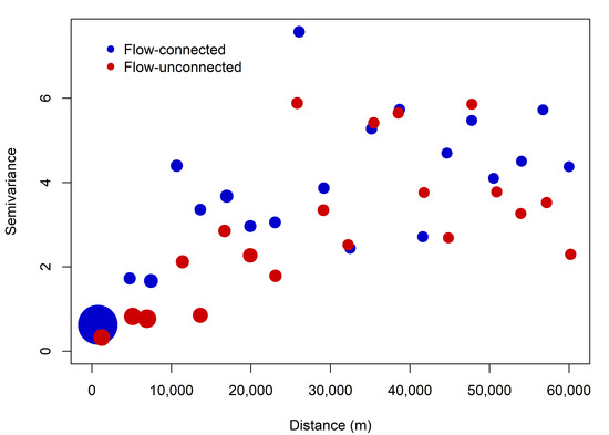 Empirical torgegram for flow-connected pairs (blue) and semivariogram for flow-unconnected pairs (red) in the network. The size of each point represents the number of pairs used to estimate the semivariance at each distance lag. The distance between flow-connected pairs corresponds to the stream distance, which is the shortest path between them following the network segments.