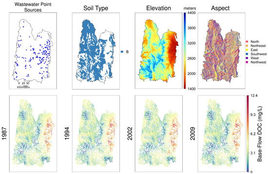 There are four significant predictors from the LASSO regression that do not change over time: number of wastewater point sources, soil type, elevation, and predominant aspect. Note that seven significant predictors from the LASSO regression do change over time (accumulated , MPB-gray phase fraction, developed and agricultural land cover fractions, base-flow mean maximum monthly temperature, and base-flow and non-base-flow mean monthly precipitation) and will be discussed in Section 4.2. Figure 7 presents a qualitative comparison of the four static predictors with the predicted base-flow DOC concentrations for four years distributed across the 30-year period of interest. Inspection of Figure 7 indicates a strong positive correlation between the number of wastewater point sources and base-flow DOC concentrations. This is expected because the increased disposal of organic waste into wastewater is associated with increased population densities in urbanized areas [73]. Nevertheless, the LASSO regression coefficient associated with wastewater point sources evidences a weaker correlation wherein the appearance of a new wastewater point source in a watershed would produce an average increase in the base-flow DOC concentrations of 0.063 mg/L. This is of course conditional on all other predictors remaining unchanged, which is unlikely in reality, but it is a convenient way to understand and measure the importance of a feature. For example, the appearance of a wastewater point source is usually accompanied with increased urbanization, which produces additional changes in DOC concentrations. This weak coefficient can be attributed to (1) the fact that the location of wastewater point sources does not account for the flow rate and associated pollution load present at each location; (2) there are non-point pollution sources associated with urbanization and industrialization that may be more significant contributors to DOC concentrations in surface water streams; and (3) although the location of a pollution source may not change over time, its pollution loads can be dynamic and highly affected by the urban changes over time associated with the discharge. Consequently, a predictor that accounts for the dynamics of urban development can be a more important predictor, as is the case with the land cover feature.