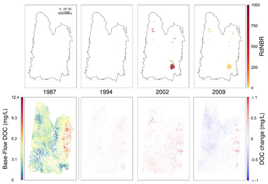 Comparison of fire severity and predicted base-flow DOC concentrations in the region of interest for the years 1987, 1994, 2002, and 2009. Instead of presenting the DOC concentrations for 1994, 2002, and 2009, the difference between their concentrations and the concentrations in 1987 are displayed to facilitate visualization. Although localized points reach values of up to 13,000, these are not common, so the color scale used for has an upper bound of 1,000 to facilitate visualization.