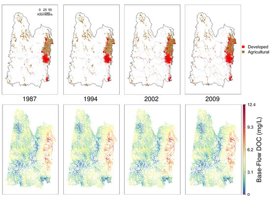 Comparison of developed and agricultural land cover with predicted base-flow DOC concentrations in the region of interest for the years 1987, 1994, 2002, and 2009.