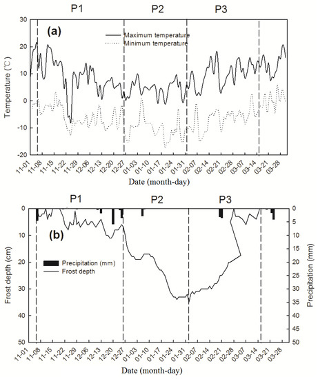 (a) Air temperature; (b) Precipitation and frost depth during the freeze–thaw period.