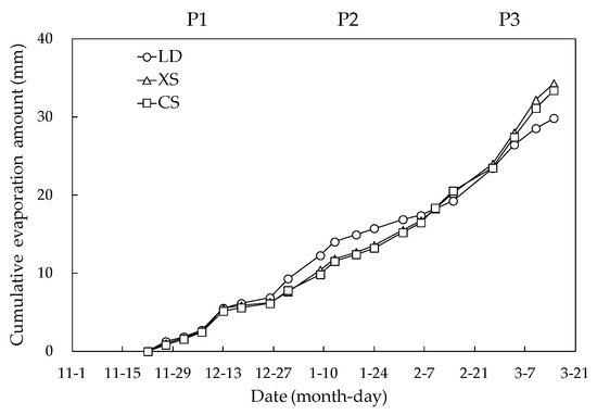 The evaporation rates of LD, XS and CS were obviously higher in P3 and lower in P1, the differences between P1 and P3 were 0.069 (LD), 0.226 (XS) and 0.215 mm·d−1 (CS), respectively. During the experiment, the greatest precipitation occurred on 13 December, 26 December, 9 January, 13 January and 26 February. Therefore, greater evaporation also occurred on or near these days, thus the evaporation rate on 13 December was 0.940 mm·d−1 for the LD treatment.