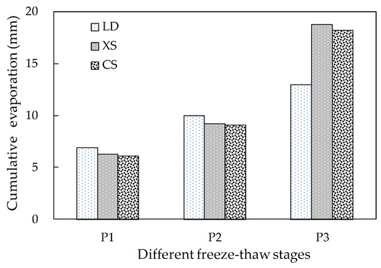 The evaporation rates under different sand mulches during the freeze–thaw period are shown in Table 3. The average evaporation rate for all three stages was 0.323 mm·d−1 for LD treatment, 0.359 mm·d−1 for XS treatment and 0.349 mm·d−1 for CS treatment. In P1, the sand layer weakened the solar radiation, which directly reached the soil surface and lessened the heat of liquid water vaporization [18,19]. The hydraulic conductivity gradually decreased with the reducing liquid water content, thus the evaporation rates of the sand mulches in P1 were less than for LD. CS treatment had the lowest evaporation rate, with a value of 0.270 mm·d−1, while LD had the largest evaporation rate (0.297 mm·d−1). The reduction was 5.41% for the XS treatment and 9.08% for the CS treatment compared with LD. The sand mulches reduced evaporation and the effect was related to the particle size in P1.