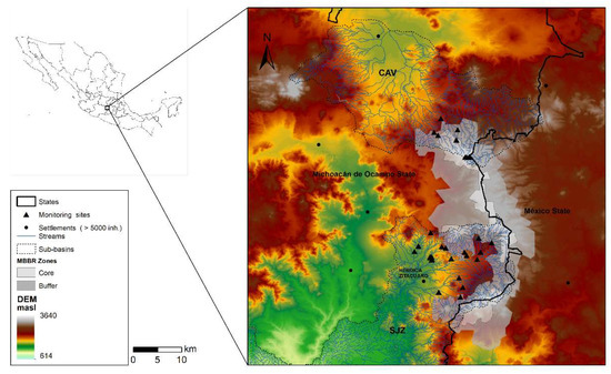 Community-based water monitoring sites in the San Juan Zitácuaro (SJZ) and Cachiví (CAV) sub-basins, at the Monarch Butterfly Biosphere Reserve (MBBR), Mexico. Settlements of more than 5000 inhabitants and fluvial networks are shown over a digital elevation model (DEM).