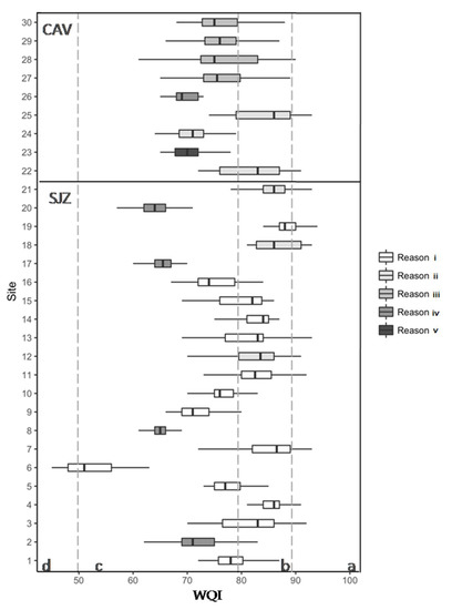 Water quality index (WQI) of San Juan Zitácuaro (SJZ), and Cachiví (CAV) monitoring sites. Vertical dashed lines are water-quality categories, indicated at the x-axis: a, Excellent; b, Good; c, Fair; and d, Poor. Boxes indicate first to third quartile, and grayscale indicates monitoring reasons: (i) safety for drinking; (ii) domestic use and recreation; (iii) habitat for biodiversity; (iv) fluvial conditions downstream of settlements; and (v) fluvial conditions at the border between buffer and core zone of the protected area. Data obtained by the Community-Based Water Monitoring Network of the Monarch Butterfly Biosphere Reserve.
