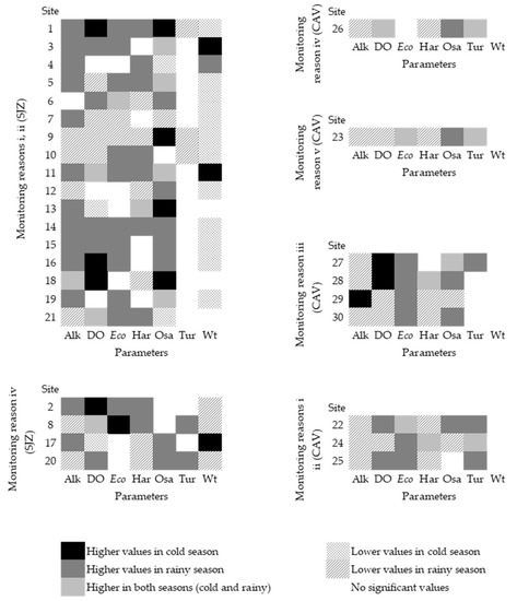 Results were grouped by seasonal variation in temperature and humidity (having a cold season from November to February, and a rainy season from June to October, being significant for detecting changes in water), into the following categories for a given parameter: ‘Higher values in cold season’; ‘Higher values in rainy season’; ‘High values in both periods’; ‘Lower values in cold season’; and ‘Lower values in rainy season’. In addition, main warnings about the condition of the sites were indicated as follows: ‘Care required to achieve acceptable minimum’ (i.e., for alkalinity and oxygen values); ‘Periods of risk for drinking and human contact’ (i.e., fecal bacteria counts); and ‘Highly vulnerable site’ (i.e., abrupt changes).