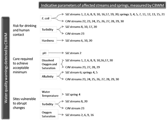 Warnings detected by the Community-Based Water-Monitoring Network at the monitored sites for springs and streams of San Juan Zitácuaro (SJZ) and Cachiví (CAV) sub-basins (site numbers refer to Table 1).
