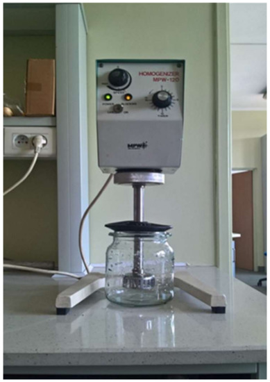 Excess sludge was mechanically disintegrated in the MPW-120 homogenizing mixer (Figure 1) equipped with a vertical shaft with a 45 mm rotor (dM = 45 mm) and a glass vessel of internal diameter DM = 115 mm and operating capacity of 0.5 L; the power density PD was 280 W L−1. This laboratory scale mixer is also equipped with control panel which allows for the parameters of the process to be set. The excess sludge was mixed for the time tM = 60, 120, 180, 240 and 300 s at speed of 15,000 rpm, which was best suited for the sludge properties. The energy parameters of the process were monitored using Lumel n12 programmable digital panel meter and presented in Table 2 [11,19,26,27].