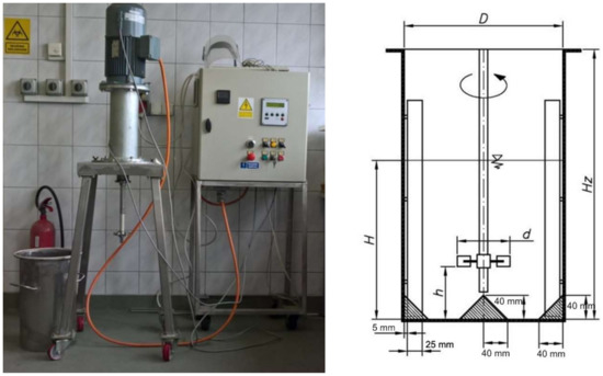 Excess sludge was disintegrated in a semi-technical, custom-built [24], sludge disintegrating mixer. It was equipped with a 2200 W motor, a vertical shaft with a rotor of d = 80 mm and a steel tank of internal diameter D = 265 mm and operating capacity of 10 L (Figure 2). The power density during the disintegration was 150 W L−1. The disintegrator is equipped with digital control and frequency converter which allows for the disintegration parameters to be set as necessary.