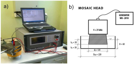 The ultrasonic disintegration process was conducted using a high-power, custom-built, sludge disintegrator [10,13]. A disintegrator setup consisted of a WK-2010 ultrasonic generator and mosaic head with short conical emitter of diameter dE = 120 mm (Figure 3). The diameter of the disintegration vessel was dK = 220 mm, the length from the emitter to the bottom of the chamber was hD = 3.0 cm.