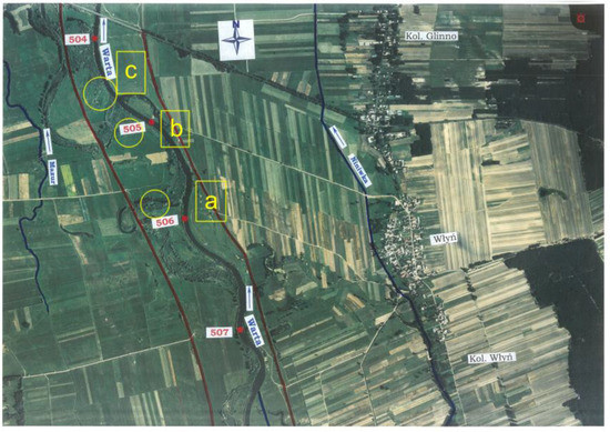 For the purpose of the study, the authors selected three areas (a, b, and c) of the floodplains of the Warta River covering the section from 505 + 720 km to 504 + 730 km (Figure 2). They represented forms of willow typical of the Central European lowland rivers. These areas were characterized by vegetation at various stages of development. The method of measuring the spacing and diameter consisted of choosing the model area of 1.0 m2 in each of the selected areas and the exact inventory of all major woody elements of the plants, including the main stems, the branches, and smaller twigs (a, b, and c areas selected as representative of the considered section of the river). The diameters and the spacing of the different woody plant parts were measured using calipers and a measure, respectively. The obtained results were then averaged to obtain a representative mean diameter and distance. It was assumed that the spacing in the direction of flow and transversely to it was equal.