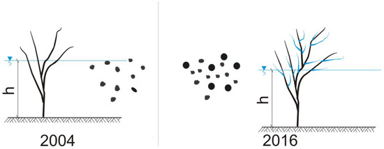 The field measurements of vegetation were carried out for the first time from 30 August to 3 September 2004. Then, they were continued in subsequent years: 11–16 July 2005 and 5 April 2006, including a section of the river from 503 to 508 km. The height of willow bushes in the reservoir and in the flood areas within the embankments ranged from 3.0 m to 5.0 m. The measurements of bush structure were made using the methodology described in research journals [58]. The local inspection carried out in the analysed areas showed various forms of shrubs. In some places, compact clusters of bushes were observed, and in others, single scattered plants were seen; sometimes, there willow plantations cultivated for regulatory works were found.