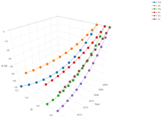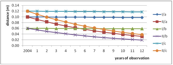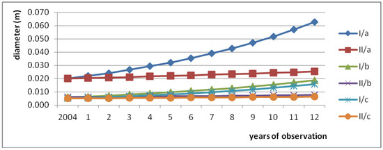 Figure 6 presents the calculated results of change in the diameter for two analysed scenarios (I and II) in three floodplain areas of the Warta River (a, b, c). In the first scenario (I), the diameters significantly changed within 12 years. A long simulation/operation period was applied, i.e., in order to spread the costs of establishing and closing the plantation [69].