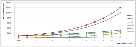 Figure 8 illustrates variability in the resistance coefficient (λ) within 12 years of simulation. With regard to scenario II considering zones a and b, the value of the resistance coefficient was three times higher than the value in other analysed cases.