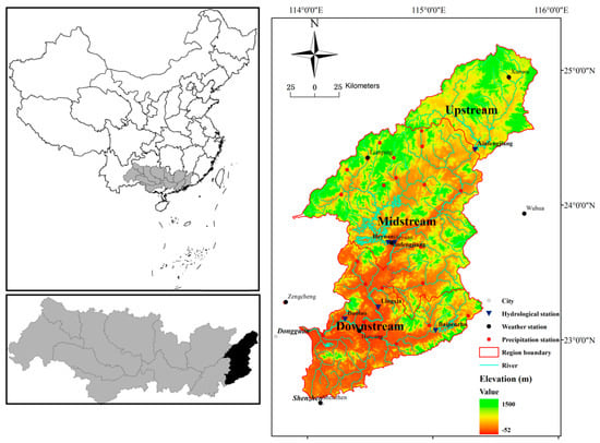 The Dongjiang River basin is located northeast of the Pearl River basin between 113°52′–115°52′ E and 22°38′–25°14′ N. The river originates from Yajibo Mountain and flows into Canton Province from northeast to southwest, with a total catchment area of 27,040 km2 [], as shown in Figure 1. This basin has a subtropical climate with a mean annual precipitation of 1750 mm and a mean annual temperature of 21 °C. Vegetation in the Dongjiang River basin is generally satisfactory, except for some local areas. The forest is the major land use type, whereas the urban area shows a rapid expansion, especially in the downstream areas.