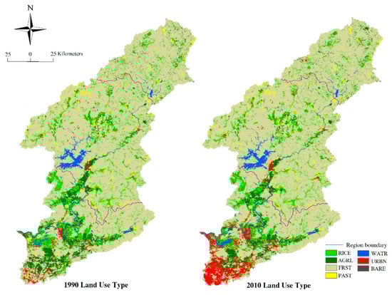 Land use type of the year 1990 and 2010 in Dongjiang River basin. RICE, AGRC, FRST, PAST, WATR, URBN, and BARE are short for rice field, agriculture, forest, pasture, water body, urban, and bare land, respectively.