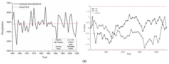 Lastly, UFk and UBk curves are generated. If these two curves intersect, and the U value of the intersection satisfies , then that point can be regarded as the abrupt point with a confidence interval of 0.05. As the time series of precipitation, temperature, and pan evaporation meet the conditions required by M–K test, we used this method to detect the abrupt points of the three series.