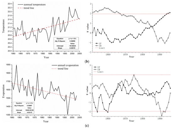 Trend and M–K test analysis of the three climatic factors in the Dongjiang River basin: (a) Precipitation; (b) temperature; (c) pan evaporation.