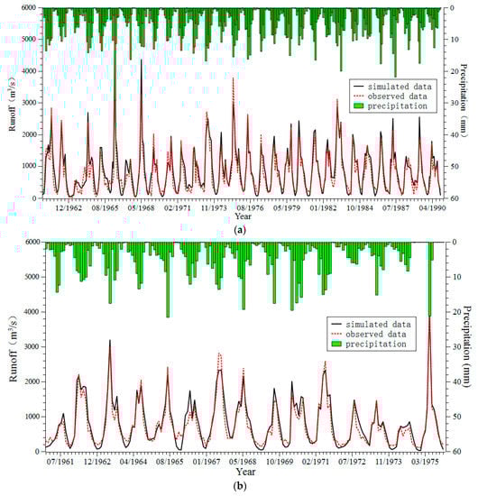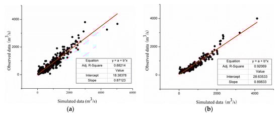 The linear regression between the simulated and observed data in calibration (a) and validation (b) period in Boluo station.