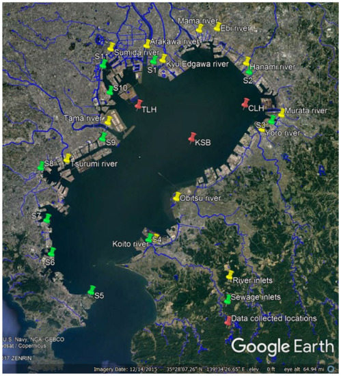 Map of Tokyo Bay with its rivers, sewer inputs, and collected data locations.