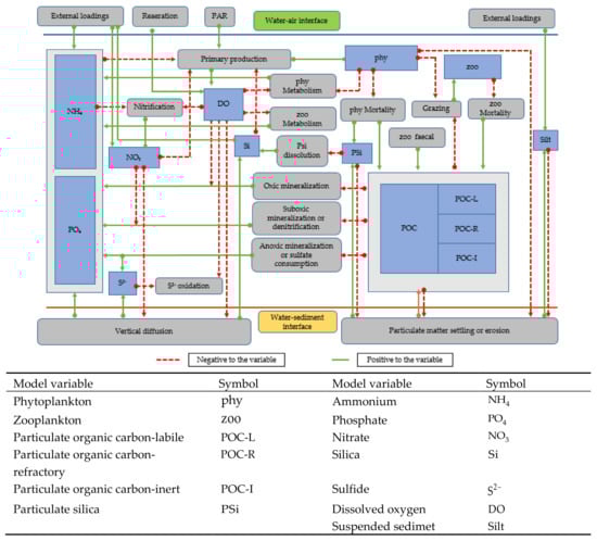 The occurrence of seasonal hypoxic and anoxic environments in shallow coastal and estuarine waters in the world has increased in the recent past, with the ensuing adverse effects to biodiversity, fisheries, and food webs. Even though observations provide information on coastal and estuarine dynamics to some extent, they are sometimes insufficient for a detailed understanding of water and sediment processes [1], analysis of restoration scenarios, and especially for future predictions on, for instance, the effect of coastal water pollution on climate change [2,3]. In order to fill this gap, with the advancement in computer technology, numerical water quality models have emerged and have been extensively developed over time to understand, analyze, and forecast estuarine and coastal environments and thereby support managerial decision making [4,5,6,7].