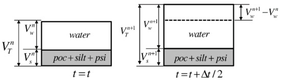 It has been assumed that porosity, , increases to () after time ( is the time interval) with the increase in POCC in the sediment. This increases the total volume of the control volume from to , as shown in Figure 5.