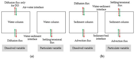 Model fluxes were computed at the air-water open boundary, bottom of the active sediment layer, and sediment–water interface (Figure 6). The benthic–pelagic model was coupled through the interaction layer flux at the sediment–water interface. The sediment–water interface has a diffusion flux of dissolved matter and a setting or erosional flux of particulate matter.