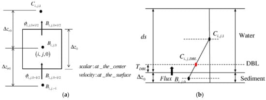 (a) 2D control volume in a vertical section and (b) boundary flux at sediment–water interface.