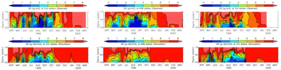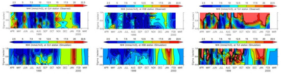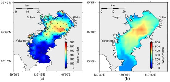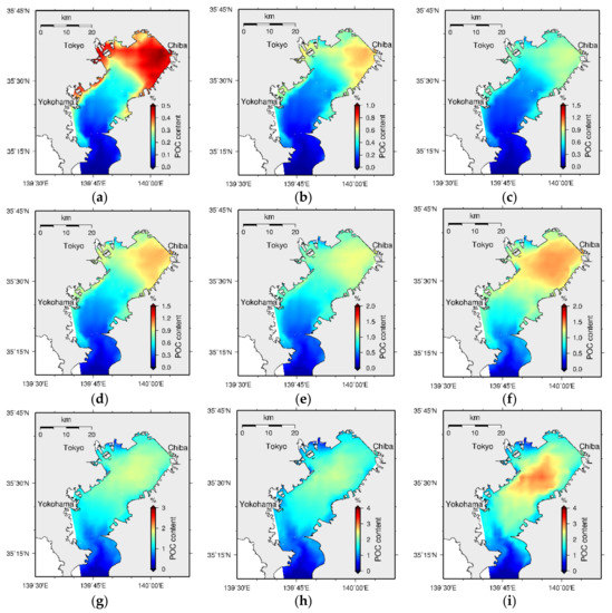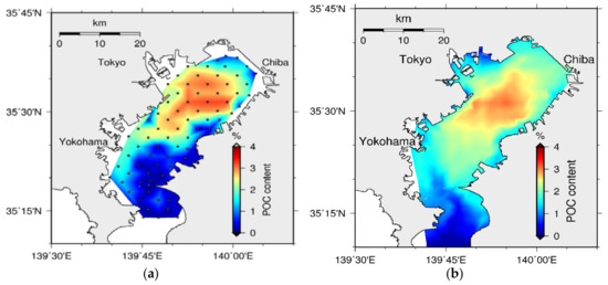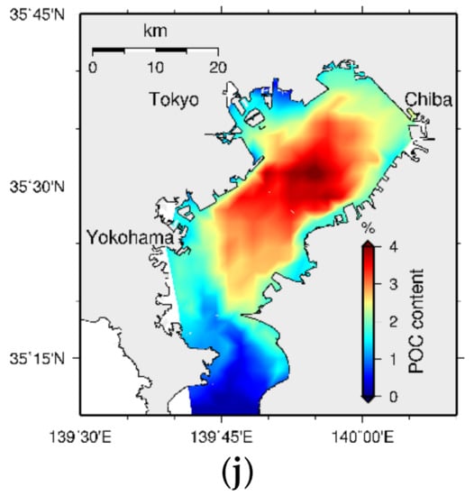 During the past decades, water quality models of Tokyo Bay have been developed to reproduce its different aspects, which have emerged by data analysis. These aspects include, for instance, some of the physical and ecosystemic characteristics of water and sediment such as upwelling and blue tide [35], the effects of waves and currents on the sediment [36], mud accumulation and bed characteristics [5,37], and seasonal/daily dynamics of water and sediment [6]. However, attempts to reproduce the spatial distributions of water and sediment quality through modeling approaches, which would support the management of water quality in the bay, are scarce or neglected. Meanwhile, the data show higher sediment water content (WC) at the inner part of the bay with a correlation to the sediment POCC [38,39], which in turn affects water quality deterioration.