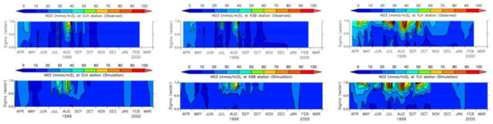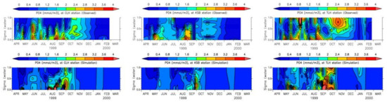 At the bottom of a water body or the sediment–water interface, dissolved nutrients and DO are constantly exchanged between the sediment bed and the overlying water through a process of diffusion, which is largely controlled by the difference in respective concentrations. However, the diffusion flux from sediment to water is controlled not only by the difference in concentration of nutrients but also by the oxygen concentration at the bottom of the water column. A zero diffusion flux for particulate matters at the sediment–water interface has been assumed. The transfer of diffusion flux from sediment to water occurs under anoxic condition, and the threshold value of the bottom layer oxygen has been considered as 2 g/m3 [53].