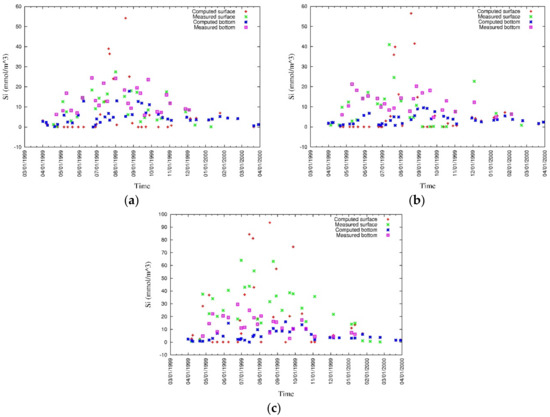 As with the pelagic model, the biochemical processes, their interconnections with other variables, and the benthic–pelagic coupling are shown in Figure 4. The main processes include mineralization under oxic, sub-oxic (denitrification), and anoxic (sulfate consumption) conditions, nitrification, oxidization of sulfide, and particulate silica dissolution. All the stoichiometric relationships associated with the biochemical processes are presented in Table 1. The expressions for the biochemical kinetic processes basically followed the formulae adopted in conventional models [19,20] (Table A4).