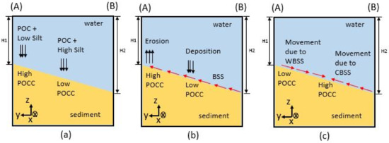 Bed formation was considered in order to compute the new layer thickness at every time step. The model was initialized with inorganic sediment, which is free from POC and becomes polluted with the POC accumulation from the water column. The accumulated POC changes the sediment porosity [39] and thereby the active sediment layer thickness with respect to the POCC.