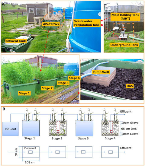 Field photos (A) and schematic representation (B) of the pilot-scale four stages tidal flow constructed wetlands (CWs).