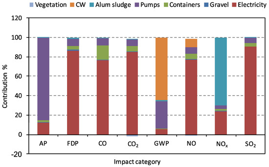 According to the results of the sensitivity analysis (Table 5), the processes holding significant influence on the environmental impact categories include electricity, HDPE, and pump. In contrast, the environmental impact categories seemed immune to other processes. In the present analysis, the DAS was regarded as a kind of byproduct of the water treatment plants. Herein, no resource or energy was input into the production of the DAS and thus, there was insignificant sensitivity coming from the DAS. In terms of the gravel, it is a natural material with little energy input and therefore, its variation induced marginal response from all the environmental impact categories. In the present study, the vegetation is also unlikely to influence the environmental impacts due to its insignificant mitigation compared with other processes, such as the electricity.