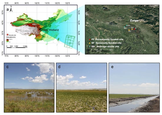 The location of (a) the study area, (b) sampling sites in the Zoige alpine peatland, (c) permanently flooded peatland, (d) seasonally flooded peatland, and (e) drained peatland.
