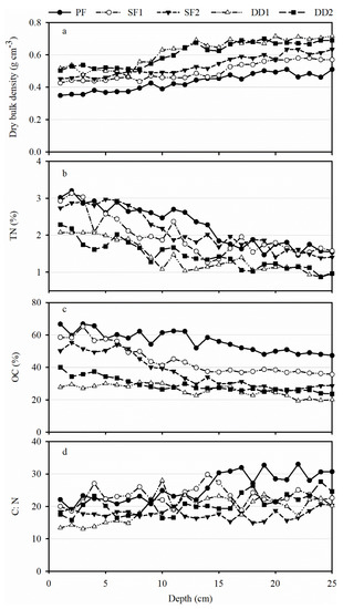 It was obvious that the dry bulk densities (DBD) of five peat sites increased with the increase of depth (Figure 2a), averaging 0.43–0.62 g cm−3 (Table 1). DBD was significantly higher in DD1 than the others, and that in PF was the lowest (p < 0.05). Across all peatland samples, the content of organic carbon (OC) and total nitrogen (TN) presented a decreasing tendency (Figure 2b,c). The average of OC ranged from 25.91% to 56.10%, with the maximum value in PF (56.10%) and the minimum value in DD1 (25.91%). Similarly, in terms of the average of TN, PF showed the highest value of 2.25% and DD1 (1.41%) was the lowest with the same case as OC, averaging 1.41–2.25%. It can be seen from Figure 2d that C:N of PF increased slightly, while other peat samples did not show the obvious increasing or decreasing tendency. Across all of the samples, C:N of PF were significantly higher than that of others (p < 0.05). On the whole, C:N of five peatlands was above or equal to 20 with an average of 17.64 (SF2)–25.86 (PF) (Table 1).