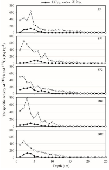 The specific activity of 210Pb and 137Cs (Bq kg−1).