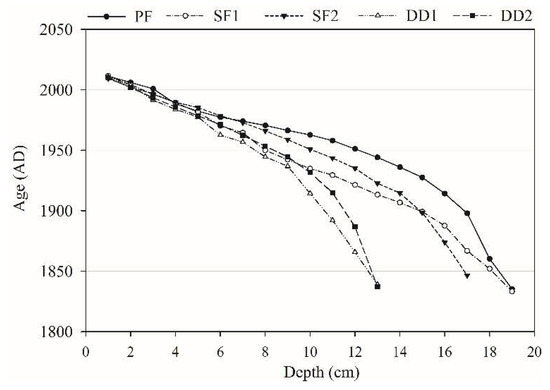 The specific radioactivity of 210Pb and 137Cs in five peat samples was shown in Figure 3. The specific radioactivity of 210Pb in PF, SF1, SF2, DD1, and DD2 reached the decay balance at a depth of 19 cm, 19 cm, 17 cm, 13 cm, and 13 cm, respectively. This research adopted the upper profile data to calculate the age of sedimentation and sediment flux of each layer. PF, SF1, SF2, DD1, and DD2 at 19 cm, 19 cm, 17 cm, 13 cm, and 13 cm were dating back to the year 1835, 1833, 1847, 1839, and 1837, respectively (Figure 4). The vertical profile distribution of 137Cs activity was shown in Figure 3. The peak of 137Cs in PF, SF1, SF2, DD1 and DD2 were at 4 cm, 5 cm, 4 cm, 4 cm, and 3 cm, respectively, and the corresponding year were in 1988, 1982, 1990, 1984, and 1993 by 210Pb dating (Figure 4). The sedimentation peak that resulted from the global nuclear test was about in 1963, with a large deviation. Therefore, we must consider the reliability that the 137Cs dating applied to the chronosequence in the peat profile.