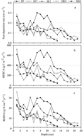 (a) Peat accumulation rate (cm yr−1), (b) RERCA (g C cm−2 yr−1) and (c) RERNA (g N cm−2 yr−1) with depths.