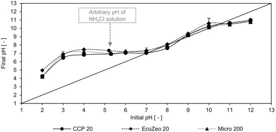 pH values of the filtrates after 20 h contact with CCP 20, Micro 200, and EcoZeo 20 (c0 = 1000 mg NH4-N/L, sorbent ration 0.1 gCLI/mgNH4-N) as a function of the initial pH values (adjusted pH values of the solution before contact with CLI).