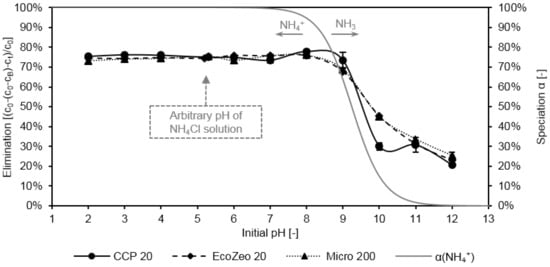 In Figure 2, the ammonium elimination by CCP 20, Micro 200, and EcoZeo 20 is depicted as a function of pH. The standard deviation around the mean value is represented by black bars. Additionally, the pH-dependent level of speciation α of ammonium is shown by the secondary axis.