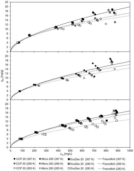 Micro 200, the particle size distribution of which extends over a wider range, adsorbed ammonium more slowly than the other two CLIs. This confirms the results of Erdogan and Ülkü [] and Huang et al. [], who achieved the fastest adsorption velocity k2 with the smallest particles. Therefore, sorbent particles should always be as small as practicable in order to achieve a high adsorption rate.