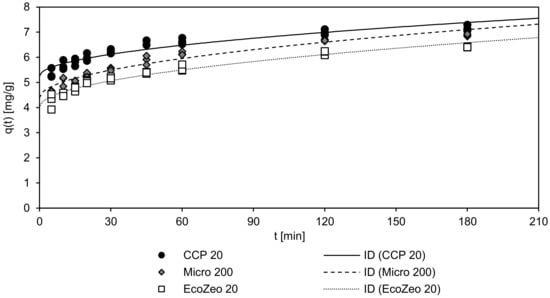 Table 8 summarizes the coefficients of the PSO model and ID model. The high coefficients of determination achieved by the ID model indicate that the adsorption speed is controlled by intraparticle diffusion. Fitting the obtained results to the PSO model reveals that CCP 20 achieved the highest adsorption rate (k2 = 0.064 g/(mg min)), followed by EcoZeo 20 (k2 = 0.048 g/(mg min)) and Micro 200 (k2 = 0.046 g/(mg min)). Equilibrium loading qe of CCP 20 was also highest (qe = 6.99 mg/g), followed by Micro 200 (qe = 6.62 mg/g) and EcoZeo 20 (qe = 6.13 mg/g). According to the ID model, the intraparticle adsorption rate kID of Micro 200 was highest (0.203 mg/(min0.5 g)), followed by EcoZeo 20 (0.191 mg/(min0.5 g)) and CCP 20 (0.159 mg/(min0.5 g)). Initial adsorption C, on the other hand, was the highest of CCP 20 (5.25 mg/g), followed by Micro 200 (4.38 mg/g) and EcoZeo 20 (4.02 mg/g). Thus, although the adsorption rates of Micro 200 and EcoZeo 20 were higher, neither CLIs reached the loading of CCP 20, which remained unattained due to the large initial adsorption by its thick boundary layer.