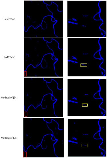 From Figure 11, it can be seen that SAPCNN successfully extracted most of the urban water bodies with complete shapes, while the extracted results by SVM, NDWI, the method of [34], and the method of [35] were incomplete. For example, SAPCNN extracted small ponds with complete shapes, whereas the results on the extracted ponds in NDWI, SVM and two water extraction methods in [34,35] were discontinuous (in the red box). From Figure 11, the water extraction results from the SAPCNN are visually cleaner, but the water extraction results from the NDWI and the SVM cannot distinguish between shadow pixels and water pixels. Here, the misidentified water pixels are found in residential areas, particularly in shadows and dark roads (in Chengdu). The extra shadow reduction procedure in the SAPCNN, the method of [34], and the method of [35] provides a larger improvement.