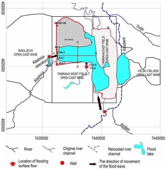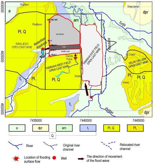 Typical case studies of these interactions from Serbia and other parts of the world, as well as of flood propagation and flood hazard simulation, are reported by many authors. For example, Brawner described methods of control of groundwater in surface mining []. Zaidel et al. used hydrodynamic modeling for estimation of seepage into underground mine workings and simulate steady-state groundwater flow from different types of rock into a vertical shaft, a horizontal drift, a ramp, two parallel drifts and a combined system of a vertical shaft connected to a horizontal drift []. Polomčić et al. and Bajić & Polomčić used hydrodynamic modeling for simulation of groundwater regime and design of groundwater control systems and describe groundwater management scenarios for the Buvač open-cast mine (Bosnia and Herzegovina) until the projected end of mining [,]. Morris et al. developed a two-dimensional hydraulic model and described groundwater flood risk mapping in the case of unconfined aquifers []; the approach recognizes the synergies between surface water flooding and groundwater flooding once groundwater has emerged at the surface. Patro et al., Pradhan & Youssef and Chen et al. conducted flood susceptibility analyses using hydrologic and hydrodynamic models [,,].