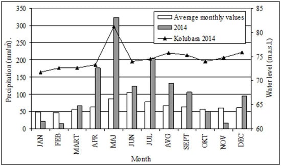 Histograms of monthly precipitation averages for the period 1961–2013 vs. 2014 (weather station at Valjevo) and monthly average stages of the Kolubara River (gauging station at Draževac).